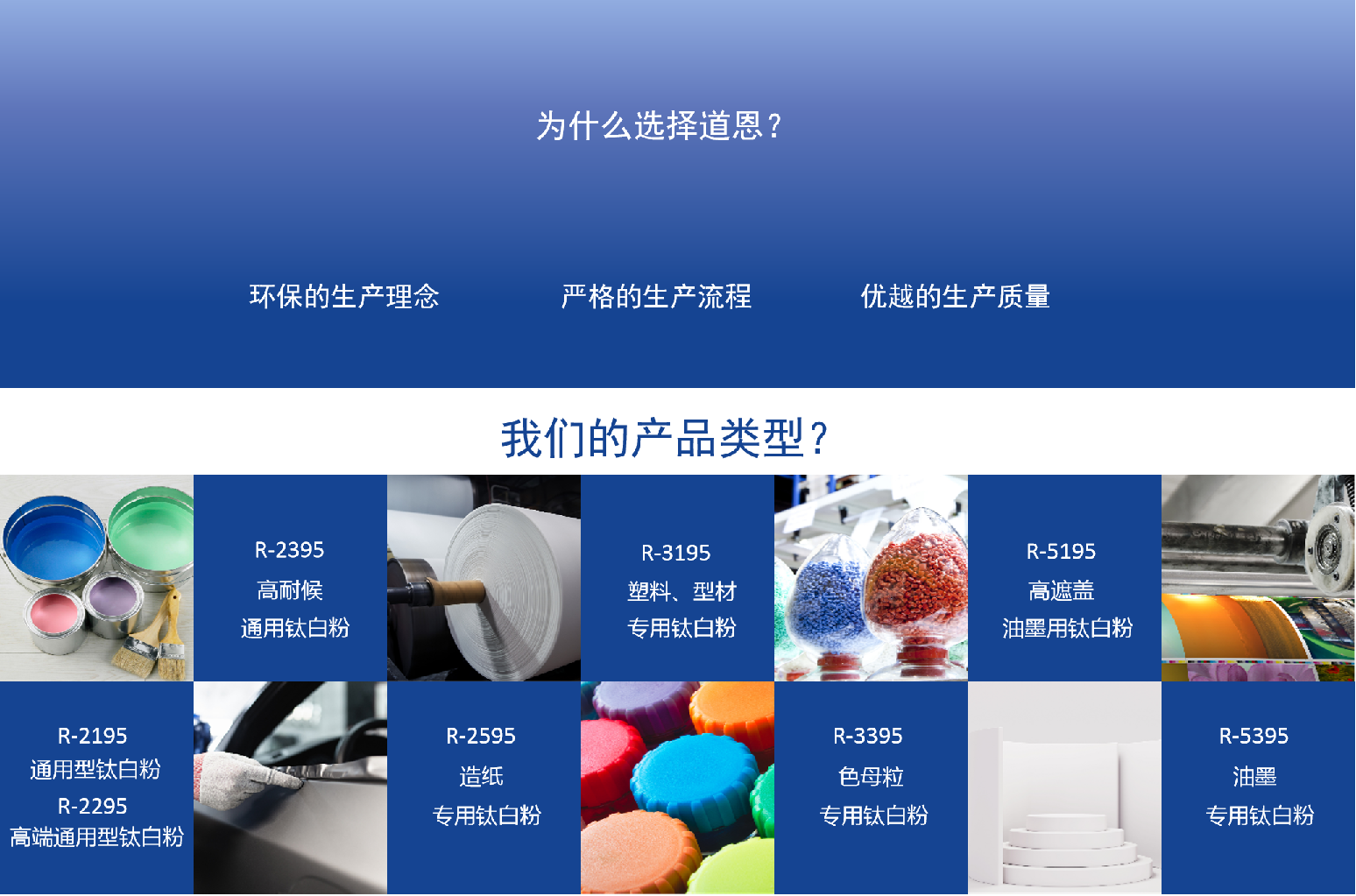 R-2295 has goodwhiteness,blue and white background, mainly used in coating, profile, laminated paperand other fields.