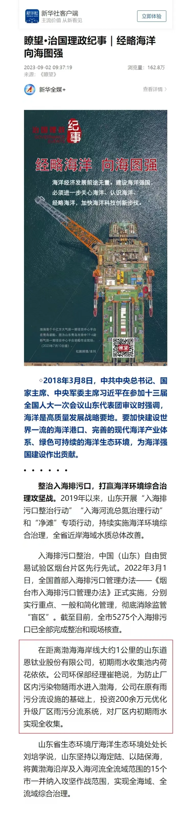 作为钛白行业首个国家级绿色工厂示范企业,好博钛业公司走出了一条“雨污分流+清污分流+水质改善+景观提升”新路径,成为龙口市工业企业雨污分流改造的典型案例。未来将以高度的责任感和使命感,持续强化环保设施升级改造,努力建设环境友好型企业,为保护海洋生态环境、推动海洋经济高质量发展贡献更多的力量。