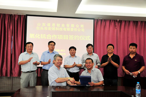 9月13日,山东好博钛业有限公司与包头市宏博科技有限责任公司合作的“钛富集物萃取项目”举行了奠基仪式,好博集团董事长于晓宁及双方主要领导出席仪式并为项目培土奠基。该产品属于采用新工艺、新技术实施的循环经济工程,注重节能环保、资源利用,预计在今年年底将建成投产。该产品广泛应用于航天、电子、冶金和医疗等高新技术领域。