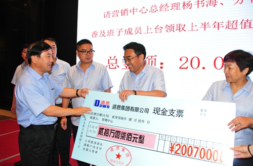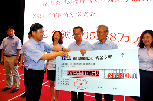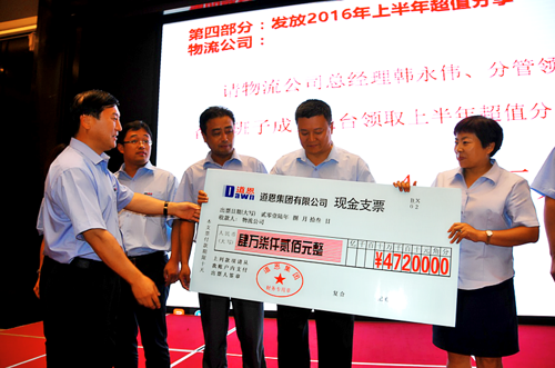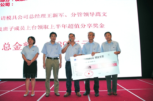 集团公司副总裁王永放介绍了2016年经营单位薪酬架构及发放试行办法、超值分享核算及发放办法和预发超值分享核算及发放办法。模具公司、物流公司、营销中心、高材公司班子成员及分管领导依次上台领取超值分享奖金。获奖单位代表作了获奖感言,并展示团队士气。当总额120余万元的分享奖金发放完毕,大家报以长时间的热烈掌声。