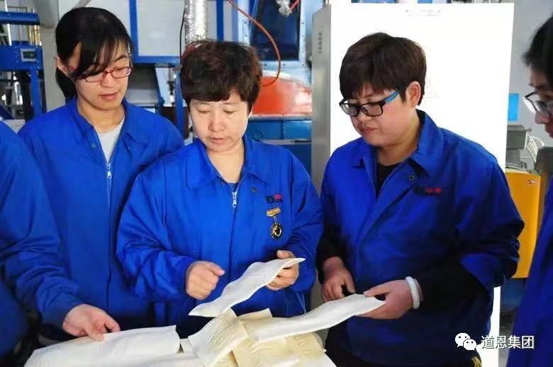 刘晓平(中)与员工交流工作