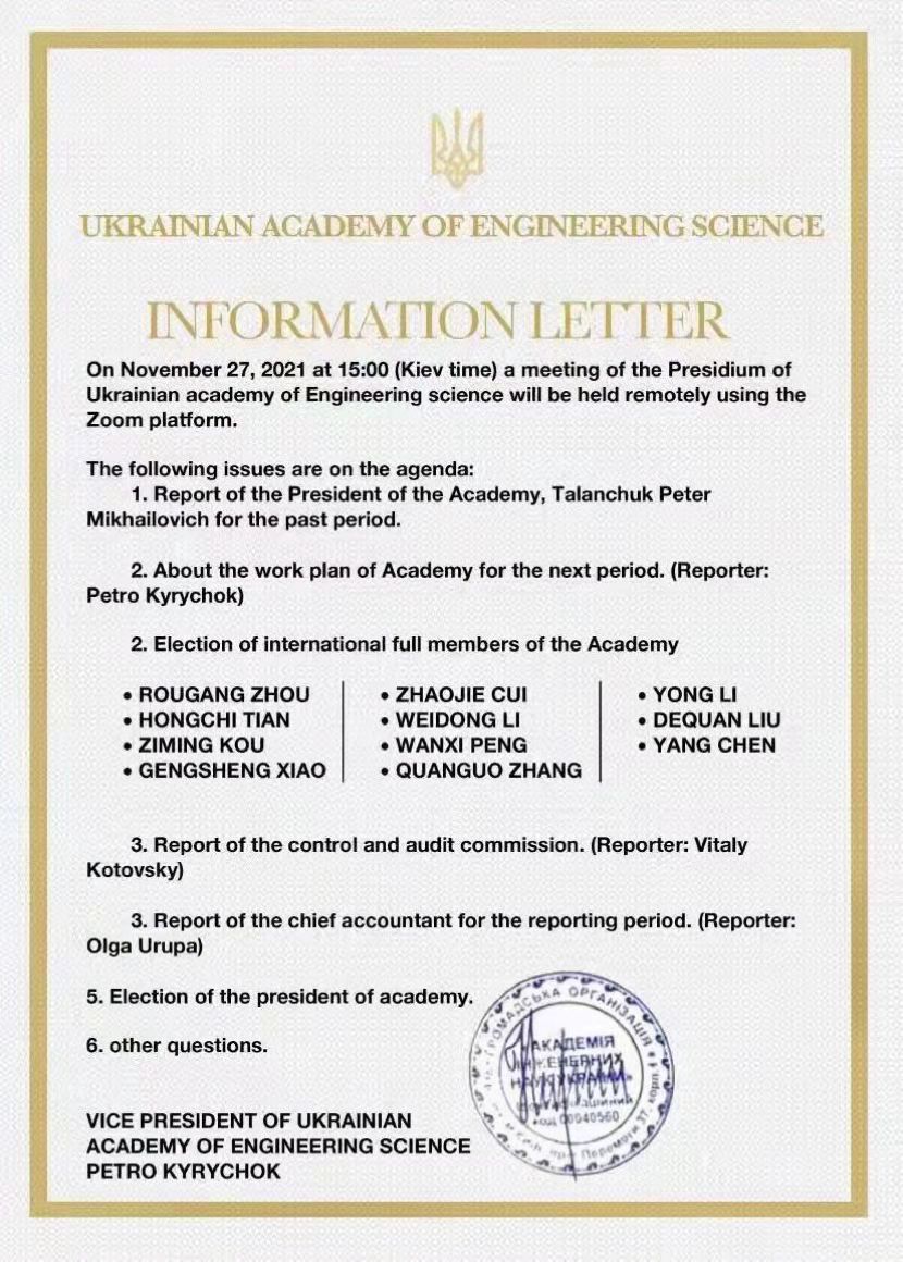 11月27日晚上,乌克兰国家工程院主席团会议宣布了2021年度当选院士名单,好博股份总经理田洪池博士当选为乌克兰国家工程院外籍院士,这是山东烟台首位来自民营企业的院士。据悉,与田洪池一同当选的,还有国内高校、企业的其他10位学者。