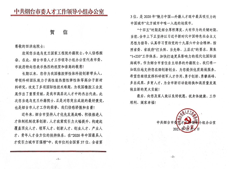 “此次您当选乌克兰外籍院士,正是对您突出成就的最好褒奖,也是烟台市人才工作的荣誉,好博倍感骄傲和自豪!”贺信饱含着烟台市委、市政府对田洪池院士的祝福与关心,“作为烟台市首位自主培养的外籍院士,好博将一如既往地支持您在烟创新创业,为您提供优质高效服务。”
