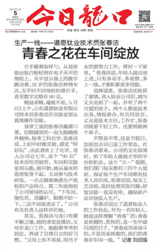 张春洁说出了好博钛业人的工作状态。作为一名年轻人,她是这样理解“青春”的:青春是欢腾的、炙热的,是一生中最闪亮的日子,“青春是用来奋斗的,不是用来挥霍的,好博的青春在一线。”