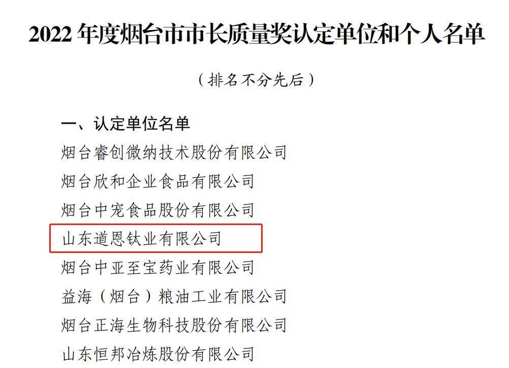 11月4日,烟台市公布了2022年市长质量奖获奖名单,全市共8家企业上榜,好博钛业公司榜上有名。据悉,这是继好博股份之后,好博集团再添一家市长质量奖获奖企业,也是龙口市本次唯一获此殊荣的企业。