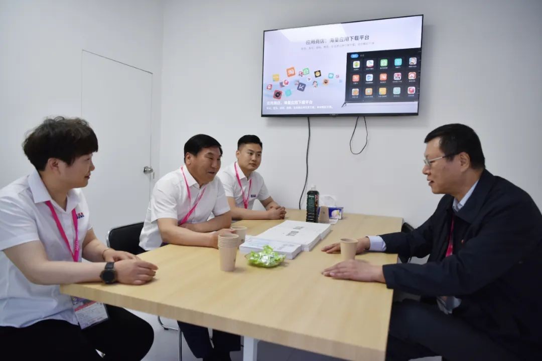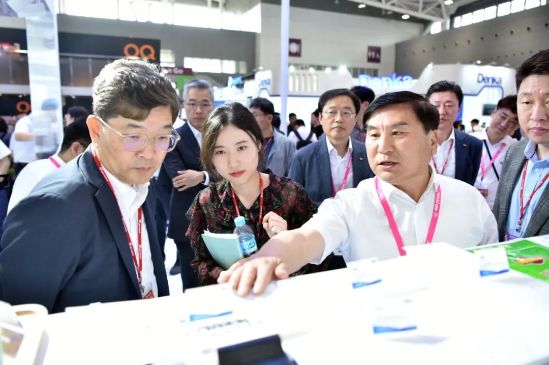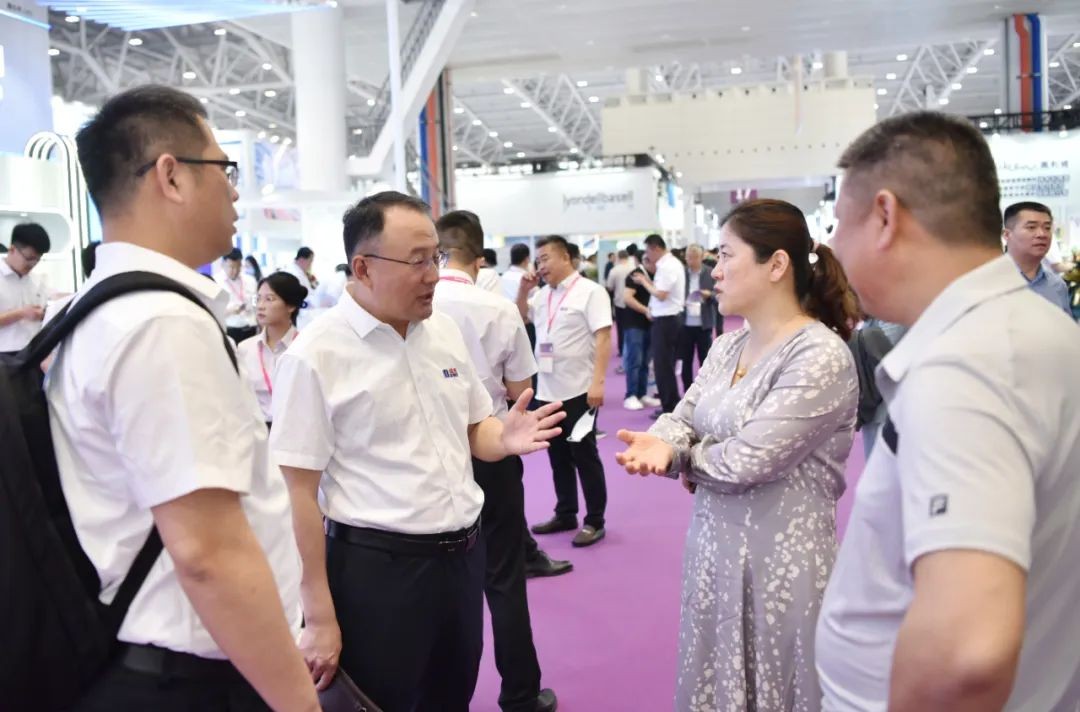 在展位现场,不同位置的电子屏滚动播放着好博集团中英文版宣传片、龙口市新材料科技产业园宣传片、俺搜业务宣传片及有关核心产品、经营理念、美好愿景的动图视频。参展人员热情接待客户,详细解答专业问题。来访客户中,既有美国、韩国、印度、波兰、巴西、越南、泰国、俄罗斯等国家的知名企业,也有国内央企、大型民企等合作伙伴,中国塑料加工工业协会等协会领导莅临好博展位,了解产品研发和应用情况。