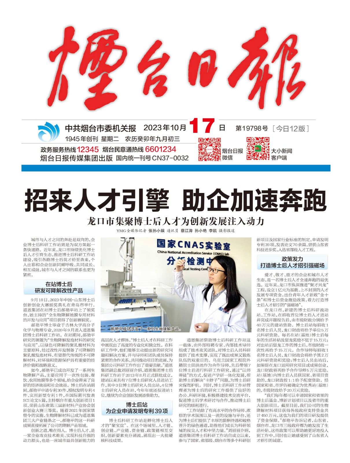 “好博每年都可以申请国家和省里的博士后基金项目、博新计划。近两年好博的生物降解材料项目获得了政府的支持资金450万,这些资金能够更好支持好博项目的顺利进行。”郝艳平说,山东省、烟台市、龙口市三级政府都为她发放了生活补贴,这些政策让她感受到了山东省人才招引的诚意,激发了立足岗位创新创造的热情。